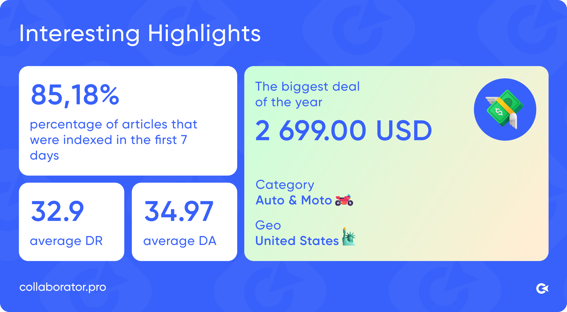 Collaborator 2025 highlights including article indexation rate, biggest deal of the year, average DR and DA metrics, and top category and geo.