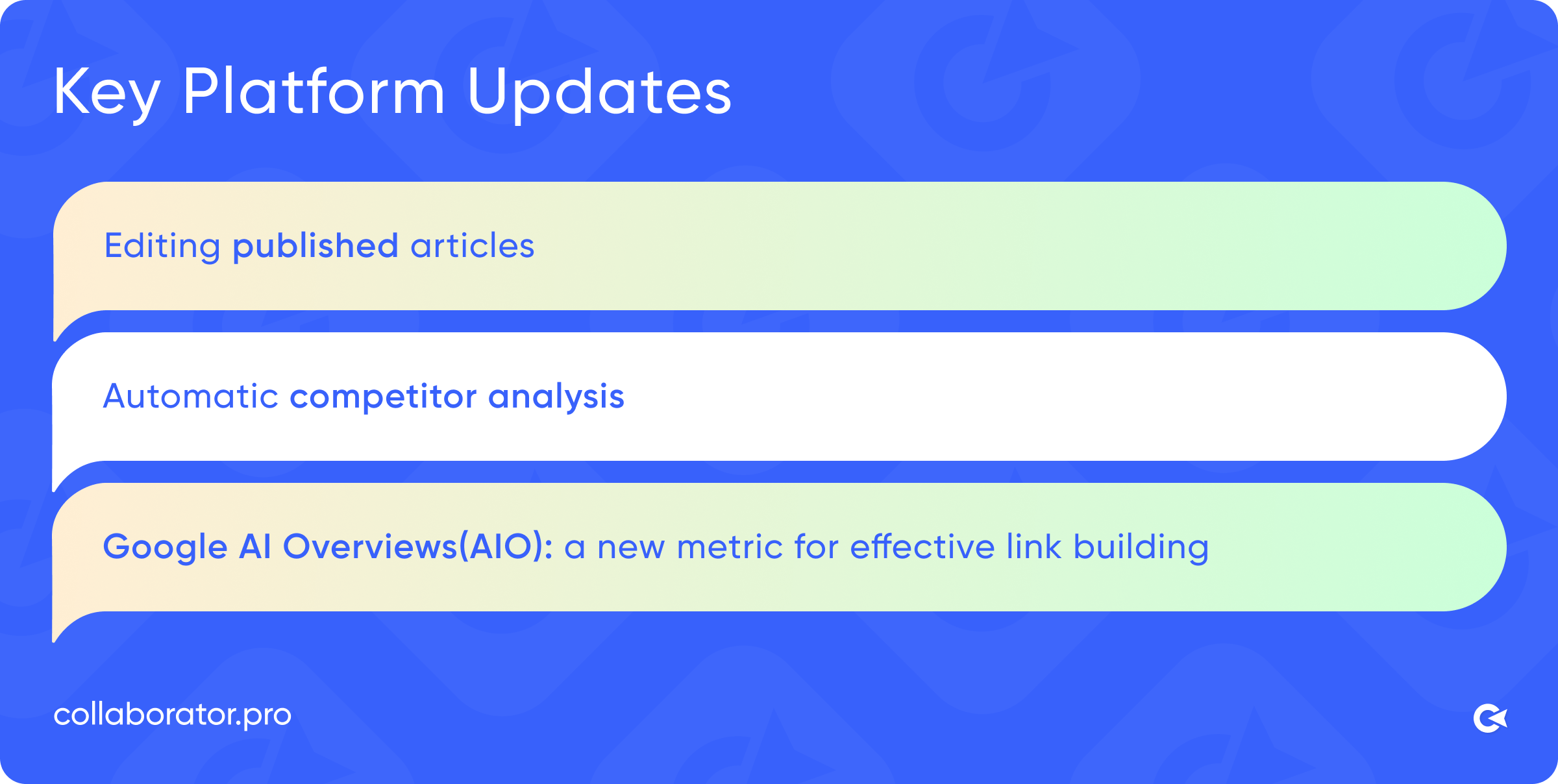 Key Collaborator platform updates for 2025, including editing published articles, automatic competitor analysis, and the Google AI Overviews metric.